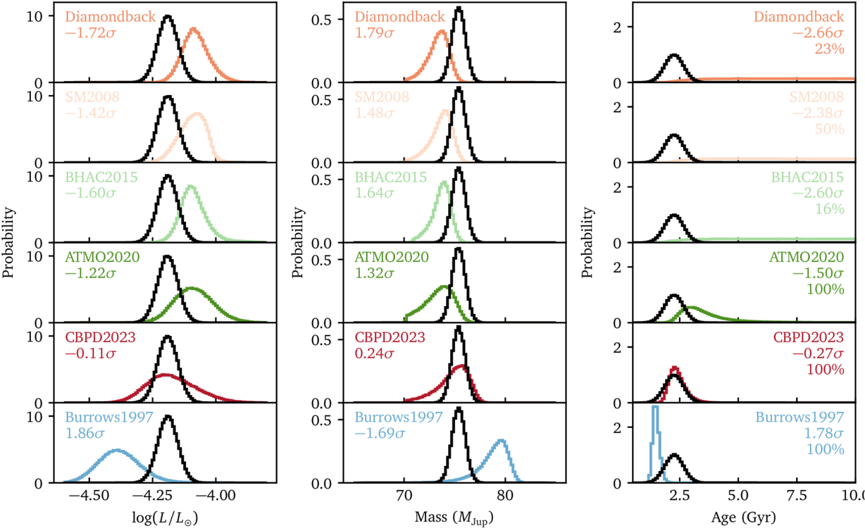 Comparisons between the observed and model-predicted properties of HR 7672B, where the predicted value of each property is calculated based on the other two. The black lines represent the observed distributions, and the colored lines show the model predictions. The numbers in each panel indicate the significance level of the discrepancy between the two distributions. In the rightmost column (age), the model-coverage fraction (the proportion of sampled points that lie within the bounds of physical models at 10 Gyr) is also shown.