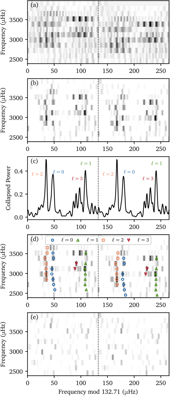 Replicated echelle diagrams showing structures of regular frequency spacings from KPF data. (a) Echelle diagrams of the original power spectrum. (b) Echelle diagram after deconvolving with the spectral window and then smoothing with a 1 μHz width Gaussian filter. (c) Collapsed echelle diagram by summing the power along the y-axis of panel (b). (d) Same as panel (b) but highlighting the oscillation modes. (e) Deconvolved power spectrum of the residual time series after subtracting oscillation modes.