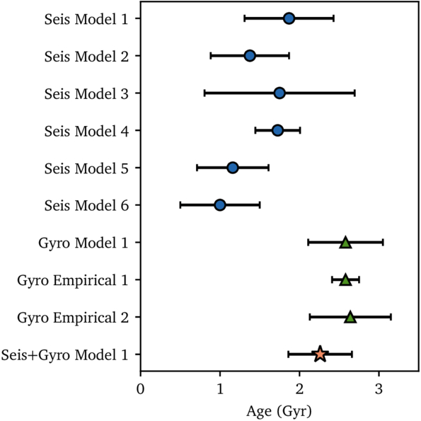Estimates of stellar ages derived from various methods, including six asteroseismic modeling ages, one rotational modeling age, two rotational empirical ages, and one asteroseismic and rotational joint modeling age.