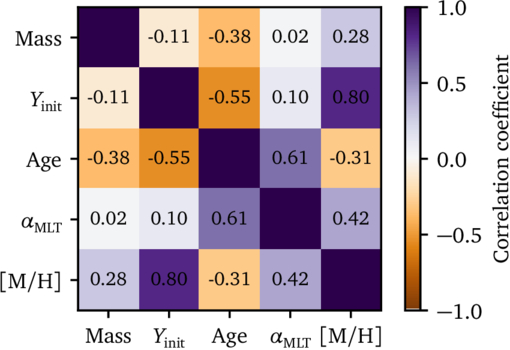 Correlation coefficients of stellar model input parameters x = (M, Yinit, Age, αMLT, [M/H]) constrained using asteroseismology, estimated from models implemented by Team 1.