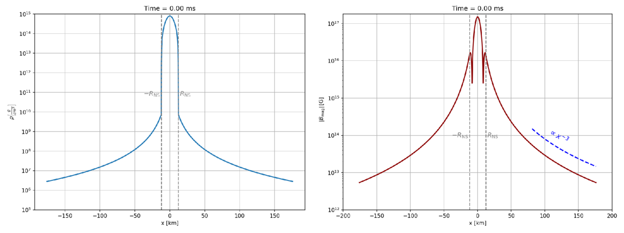 One-dimensional plots along the coordinate x-axis for model P1U0. Left panel: density in log-scale. Right panel: magnetic field strength in log-scale. Gray dashed lines represent the NS initial radius RNS(t = 0).