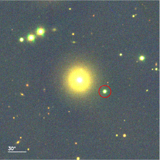 A three-color composite image of SN 2024aedt, observed by WFST on 2024 December 12–25. The image is constructed from u (blue), g (green), and r (red) filter data. The position of the SN is marked by the red circle. A 30″ scale bar is shown in the lower left corner.