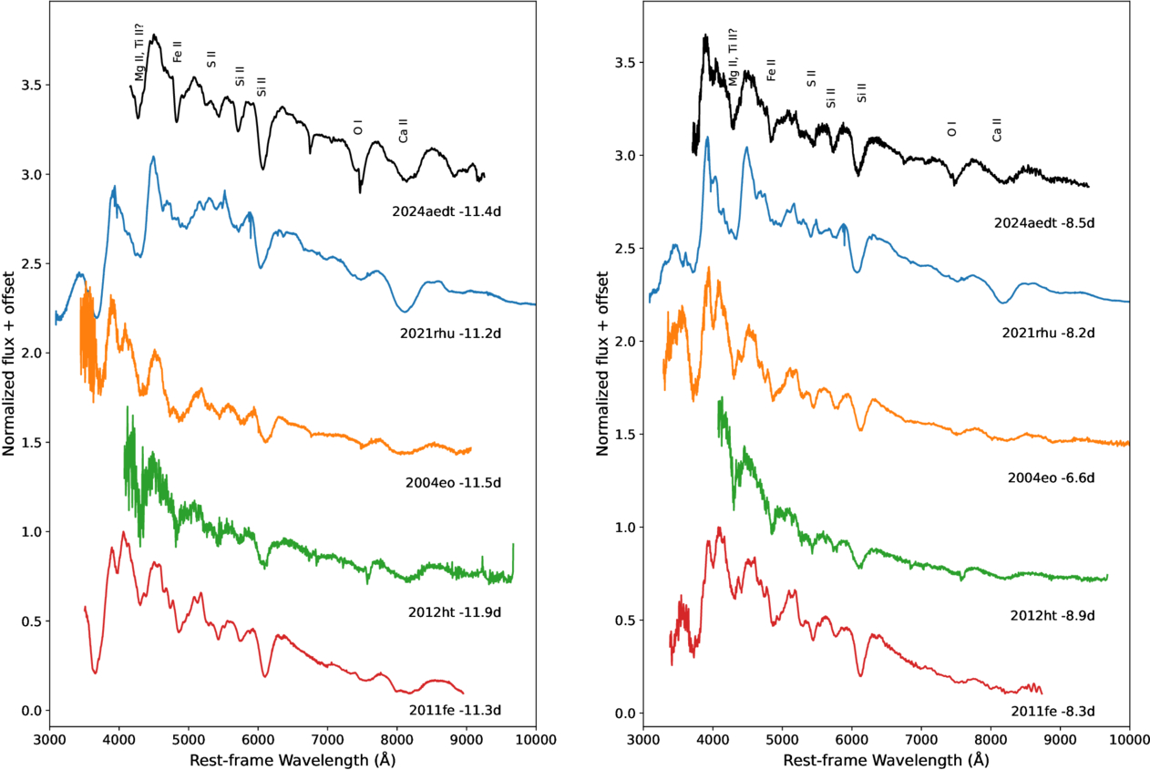 Comparison of spectra at similar phases. The spectrum of SN 2024aedt is shown in black, plotted against other SNe Ia from the comparison sample. Each spectrum is normalized and vertically offset for clarity. See Section 3.4.2 for details.