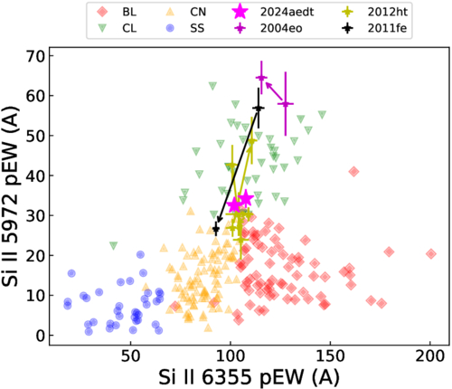 Early-time evolutionary tracks on the Branch diagram. The track for SN 2024aedt is shown in magenta, plotted alongside the normal SN 2011fe (black) and two other transitional SNe Ia. See Section 3.4.2 for a detailed description.