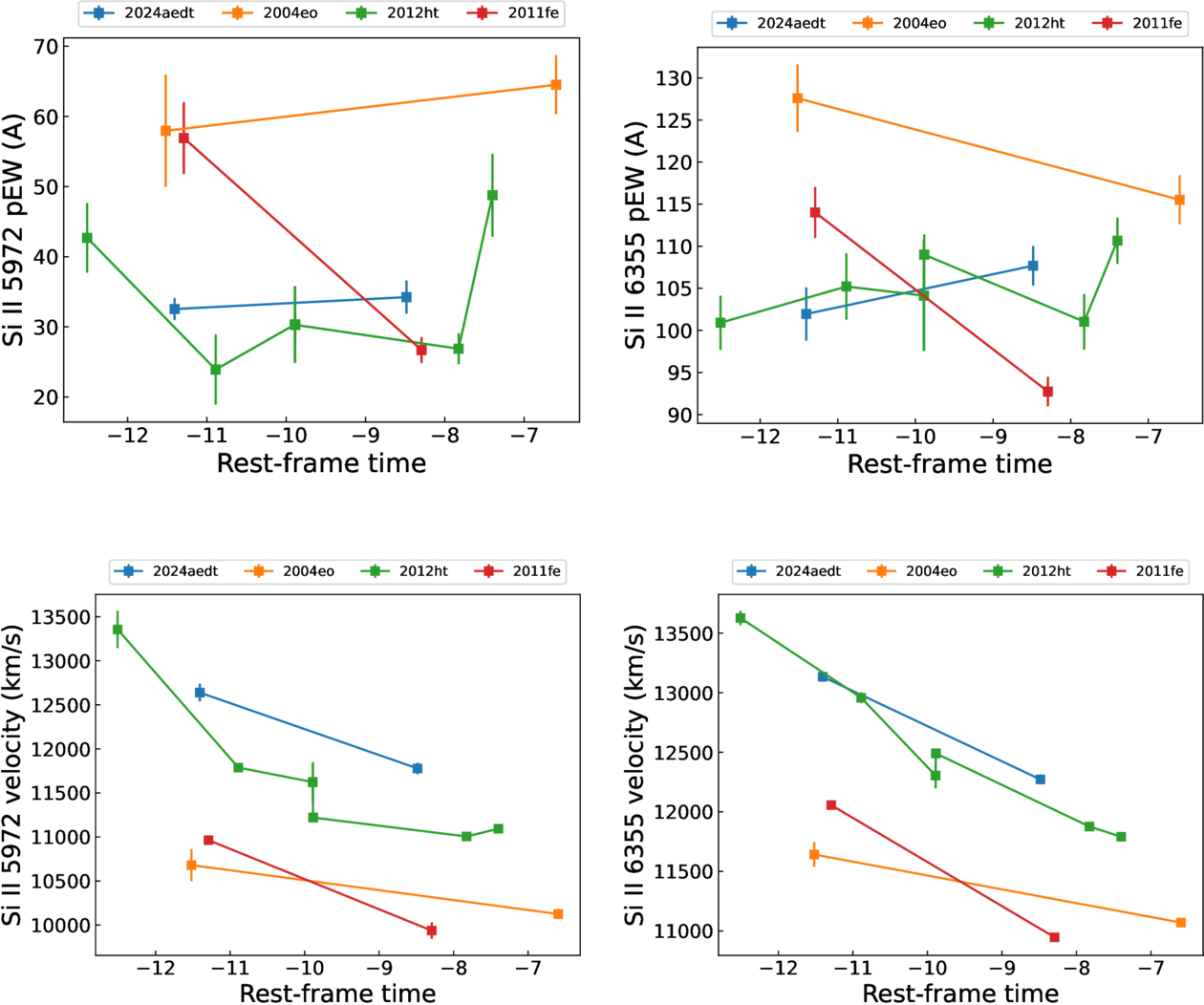 Evolution of the properties of the Si II doublet for SN 2024aedt and the comparison sample. The top panels show the pEW evolution for the Si II λ5972 (left) and Si II λ6355 (right) lines. The bottom panels show the corresponding velocity evolution measured from each line.