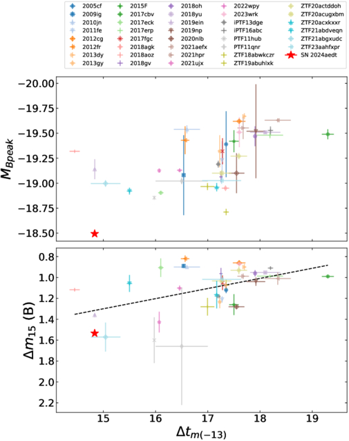 Top panel: MB,max vs. Δtm(−13). Bottom panel: Δm15(B) vs. Δtm(−13). The position of SN 2024aedt is shown for comparison with the sample from W. Wu et al. (2025).