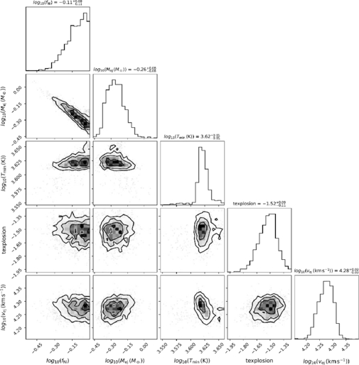 Corner plot showing the posterior probability distributions for the parameters of the MOSFiT fit.