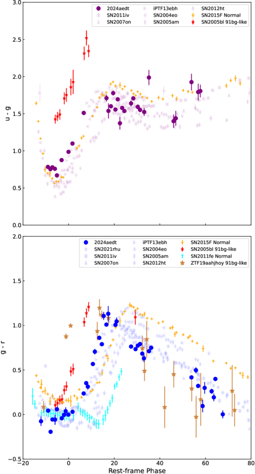 Color evolution comparison for SN 2024aedt and other SNe Ia. The data are coded by color and opacity as follows: SN 2024aedt (filled purple and blue points), the transitional SN Ia sample (semitransparent points), the normal SN 2011fe (cyan), the slightly subluminous normal SN 2015F (orange), and the SN 1991bg–like SN 2005bl (red) and ZTF19aahjhoy (peru).