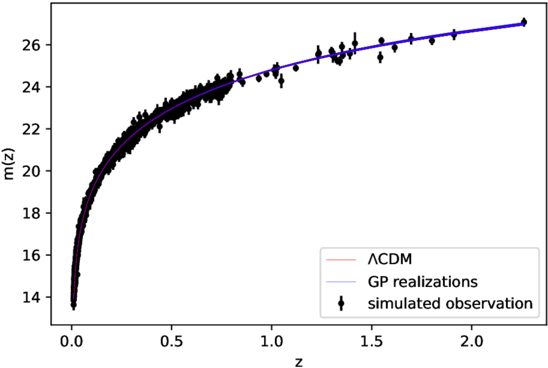 The simulated observation of magnitudes ﹩{m}_{{\rm{unlensed}}}^{{\rm{obs}}}﹩ and the reconstructed magnitudes ﹩{m}_{{\rm{unlensed}}}^{{\rm{GP}}}﹩.