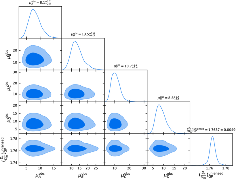 The joint distribution of the distance ratio ﹩{({D}_{s}/{D}_{d}s)}_{{\rm{GP}}}^{{\rm{unlensed}}}﹩ (Equation (17)) and the magnifications ﹩{\mu }_{i}^{{\rm{obs}}}﹩ (Equation (12)), constructed from 1000 GP realizations of the unlensed SNe Ia combined with the simulated lensed SN Ia data (zs = 1.5, zd = 0.5).