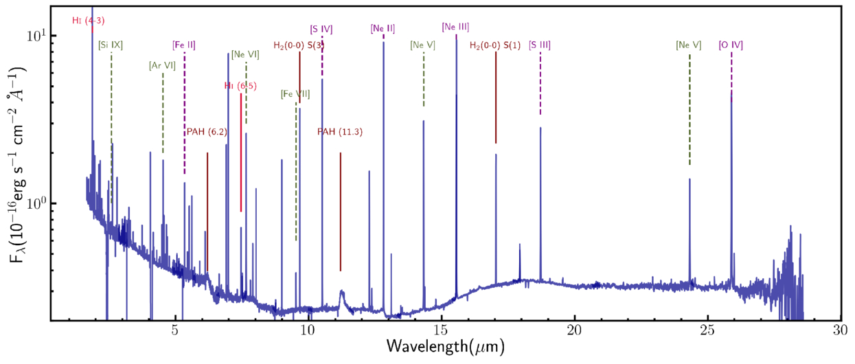 Aperture-corrected nuclear spectrum of NGC 4395, extracted from the central region, spans the rest-frame wavelength range 1.66–28.6 μm, combining observations from JWST/NIRSpec and MIRI Channels 1–4. Some of the prominent emission lines are indicated along the spectrum. Molecular features, including PAH and H2 lines, together with HI recombination lines, are shown by solid lines, while ionized gas lines are denoted by dashed lines. Low-ionization species (e.g., [Fe II], [Ne II], [S III], [O IV]) are marked in purple, whereas high-ionization lines are indicated in dark green.
