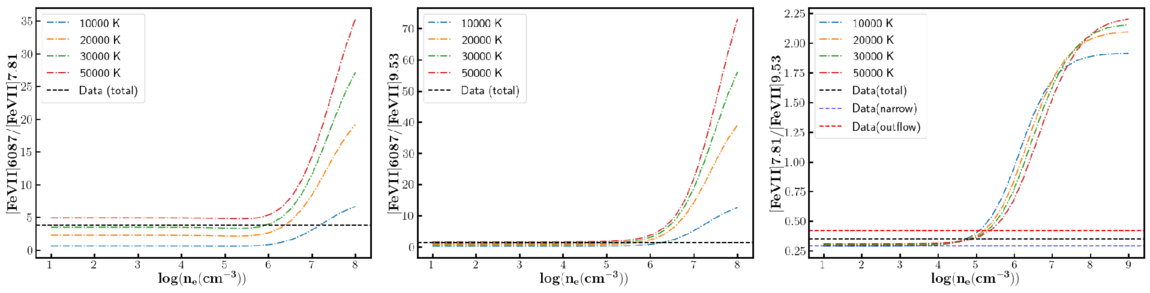 Variation in different line ratios with density for different particular temperatures, which represent different curves in each plot, and are denoted by individual legends in each plot. The horizontal line in each plot represents the observed line ratio.