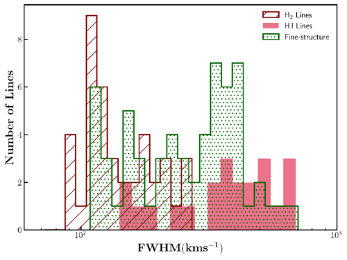 Distribution of the observed FWHM values (uncorrected for instrumental resolution) for the different gas phases: H2, H I, and fine-structure lines.