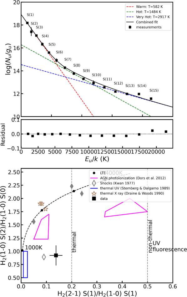 Upper panel: rotational excitation diagram of the pure molecular hydrogen emission lines. The solid lines indicate the best-fit models, while the points represent the observed data. The residual panels show the normalized residuals, defined as (data−model)/data. Lower panel: Lower panel: excitation diagram of the H2 rovibrational line ratios, H2(2–1) S(1)/H2(1–0) S(1) vs. H2(1–0) S(2)/H2(1–0) S(0). Ratios with H2(2–1) S(1)/H2(1–0) S(1) ≲0.2 indicate predominantly thermal excitation, while ratios ≳0.5 are characteristic of nonthermal excitation dominated by UV fluorescence (H. Mouri 1994). The black points connected by dotted lines represent LTE predictions for temperatures between 1000 and 4000 K (R. A. Riffel 2021). The pink shaded region corresponds to AGN photoionization (O. L. Dors et al. 2012), the gray diamond symbols mark shock-excited regions (J. H. Kwan et al. 1977; M. D. Smith 1995), and the blue shaded region denotes thermal UV excitation (A. Sternberg & A. Dalgarno 1989). The brown star symbols indicate thermal X-ray excitation (B. T. Draine & D. T. Woods 1990). The solid black square with error bars represents the measured line ratios for NGC 4395.