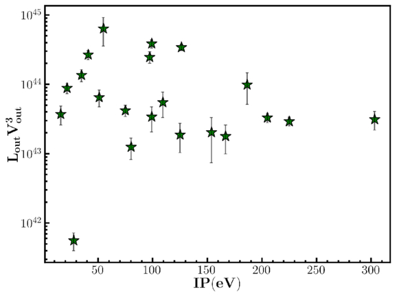 Variation in ﹩{L}_{{\rm{out}}}{V}_{{\rm{out}}}^{3}﹩ with IP. ﹩{L}_{{\rm{out}}}{V}_{{\rm{out}}}^{3}﹩ is in the unit of erg s−1 (km s−1)3.