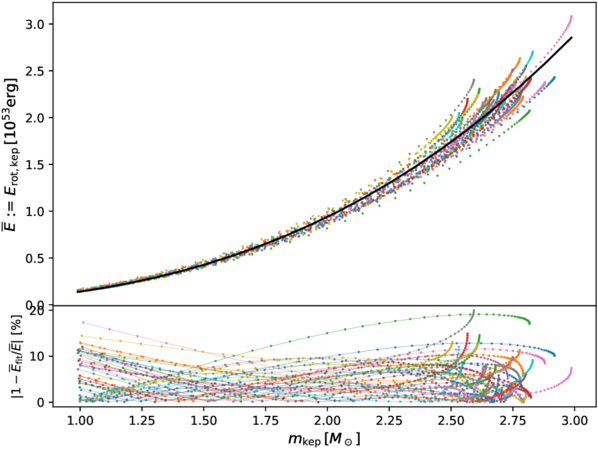 Rotational energy at the Kepler limit, Erot,kep (in 1053 erg), as a function of the neutron star mass mkep. The black line is a polynomial fit, and the bottom panel displays the fractional residual.