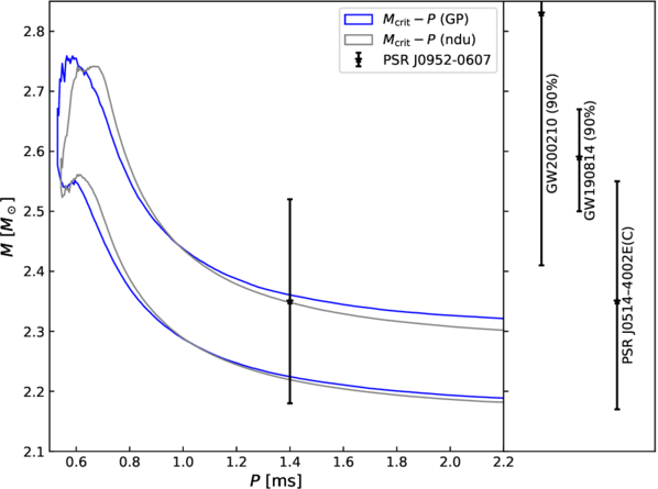 Critical collapse mass Mcrit as a function of rotation period P. The blue and gray curves correspond to the GP and ndu models, respectively. The data of PSR J0952–0607 (R. W. Romani et al. 2022), the companion of PSR J0514–4002E (E. D. Barr et al. 2024), and the secondary stars of GW190814 and GW200210 (R. Abbott et al. 2023) are shown for comparison.