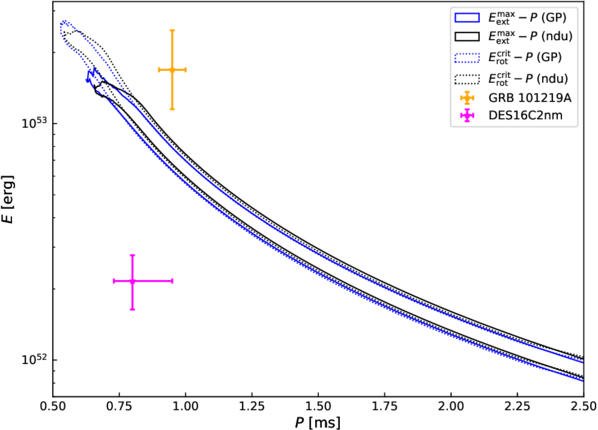 The solid lines show the maximum extractable rotational energy, ﹩{E}_{{\rm{ext}}}^{{\rm{\max }}}﹩, for neutron stars with baryonic mass equal to Mb,TOV as a function of rotation period P. The dotted lines represent the maximum rotational energy of neutron stars at a given period. Blue and black curves correspond to the GP and ndu models, respectively. The inferred parameters of DES16C2nm (B. Hsu et al. 2021) and GRB 101219A (A. Rowlinson et al. 2013) are shown for comparison.