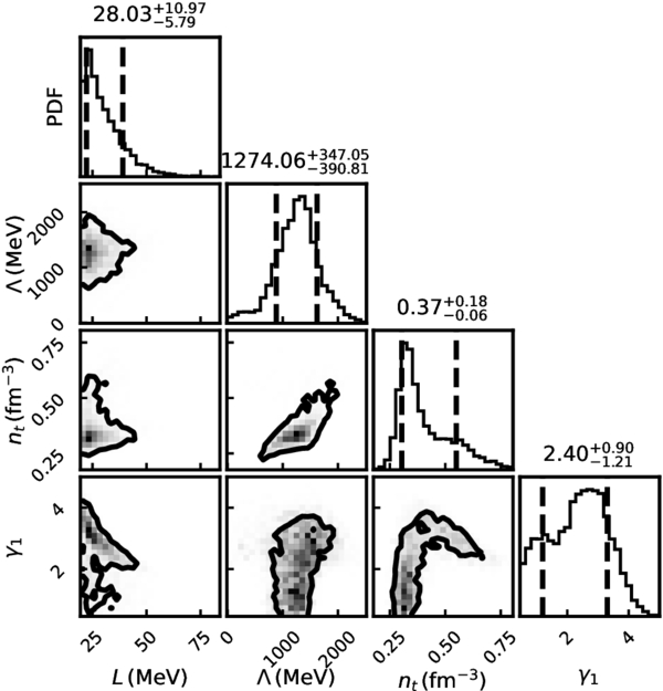 Posterior distributions of key parameters from the quarkyonic model, including the slope of symmetry energy L, the parameter Λ, the threshold density nt, and the potential parameter γ1. The values and their 68.3% credible intervals are shown for each parameter.