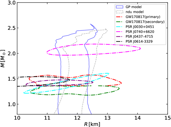The 68.3% credible mass–radius intervals reconstructed using the GP (blue) and quarkyonic (gray) models. The mass–radius data for PSR J0030+0451, PSR J0740+6620, PSR J0437–4715, PSR J0614–3329, and the components of the GW170817 event are shown for comparison.