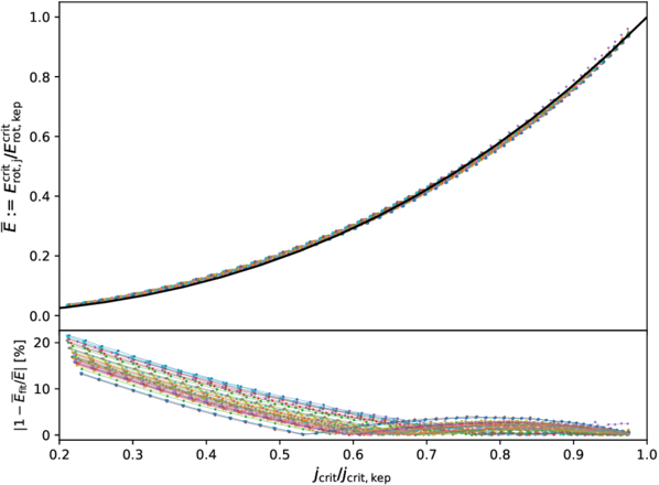 Normalized critical rotational energy, ﹩\overline{E}={E}_{{\rm{rot}},{\rm{j}}}^{{\rm{crit}}}/{E}_{{\rm{rot}},{\rm{kep}}}^{{\rm{crit}}}﹩, plotted as a function of the normalized spin parameter, jcrit/jcrit,kep. Colored points in the top panel represent the rotational properties of neutron stars computed from posterior samples of our EOS ensemble, while the solid black curve shows a polynomial fit to the data. The bottom panel displays the fractional residual, ﹩| 1-{\overline{E}}_{{\rm{fit}}}/\overline{E}| ﹩.