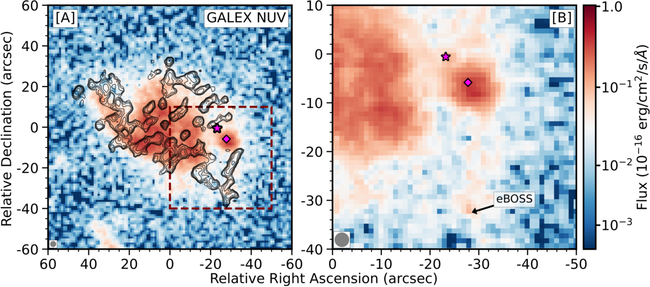 (A) The GALEX NUV image of NGC 4141 (color scale; D. C. Martin et al. 2005), overlaid on the GMRT H I 21 cm moment-0 image at an angular resolution of ﹩3\mathop{.}\limits^{^{\prime\prime} }0﹩ (contours). (B) A zoom-in on the maroon dashed square shown in (A), without the H I contours. The location of the eBOSS spectrum is indicated by the arrow. It is clear that only weak NUV emission is detected at this location. In panel (A) and (B), the gray circle in the inset at the bottom left indicates the GMRT synthesized beam.