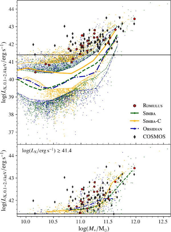 LX–M* relations for observed and simulated BGGs. Top panel: the initial samples of simulated BGGs for all LX. The SIMBA, SIMBA-C, and OBSIDIAN BGGs are represented by median lines, with outer lines and data points showing the 16th and 84th interpercentile regions and outer scatter. The black line illustrates the COSMOS minimum ﹩\mathrm{log}({L}_{{\rm{X}},\,0.1-2.4\,{\rm{keV}}}/{\rm{erg}}\,{{\rm{s}}}^{-1})\simeq 41.4﹩. All other formatting follows that of Figure 1. Bottom panel: the selected samples satisfying ﹩\mathrm{log}({L}_{{\rm{X}}}/{\rm{erg}}\,{{\rm{s}}}^{-1})\gtrsim 41.4﹩. All SIMBA, SIMBA-C, and OBSIDIAN BGGs are shown as data points in addition to their medians.