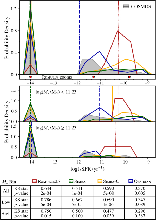 BGG sSFR distributions. The top panel depicts the full BGG samples, the middle panel shows BGGs in the low-M* bin with ﹩\mathrm{log}({M}_{* }/{M}_{\odot })﹩ < 11.23, and the bottom panel shows BGGs in the high-M* bin with ﹩\mathrm{log}({M}_{* }/{M}_{\odot })\gtrsim 11.23﹩ (see Table 1). All BGGs with ﹩\mathrm{log}({\rm{sSFR}}/{{\rm{yr}}}^{-1})\,\leqslant \,-12﹩ are set to ﹩\mathrm{log}({\rm{sSFR}}/{{\rm{yr}}}^{-1})﹩ = −14 to account for the minimum detection threshold of sSFR (see the text). All other formatting follows that of Figure 3. The table contains the results of two-sided K-S tests comparing the simulation samples’ distributions of measurable ﹩\mathrm{log}({\rm{sSFR}}/{{\rm{yr}}}^{-1})\gt -12﹩ to that of the COSMOS sample. The top, middle, and bottom rows, respectively, compare ﹩\mathrm{log}({\rm{sSFR}}/{{\rm{yr}}}^{-1})\gt -12﹩ distributions in the full, low-M*, and high-M* samples.