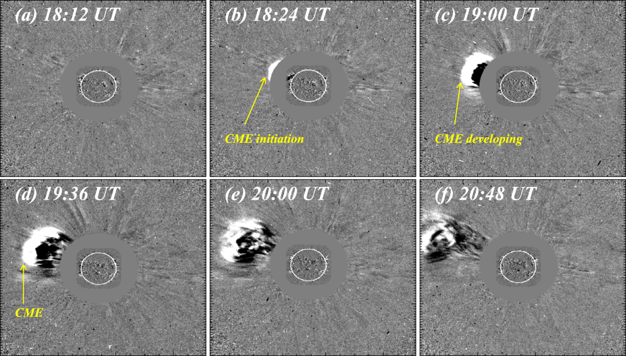 The evolution of CME, as observed by the C2 coronagraph of LASCO. The CME appears around 18:24 UT, as indicated by the yellow arrow in panel (b). Further, the CME evolves with time as displayed in panels (d)–(f).