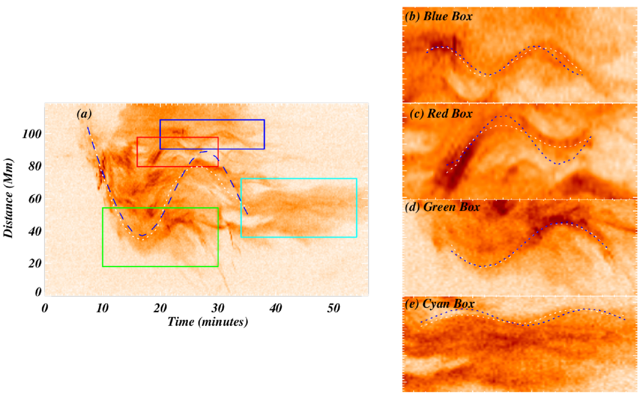 The TD image in panel (a) shows the transverse oscillation, and this TD image corresponds to panel (c) of Figure 7. The main oscillation is tracked manually (white-dashed path), and further fitted using Equation (2) (blue-dashed curve). Further, the individual oscillations are spotted in four different plasma threads, and the region of these oscillation are outlined by the blue, red, green, and cyan color boxes. The zoomed-in views of these boxes are shown in panels (b)–(e), respectively. Further, the transverse oscillations are tracked manually; see the white-dashed paths in panels (b)–(e). Next, the manually tracked paths are fitted using Equation (1), and the fitted curve is shown by the blue dotted lines in panels (b)–(e).