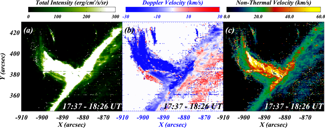 Panels (a)–(c) show the spectral intensity, Doppler velocity, and nonthermal velocity maps of the observed region, respectively. These maps are obtained by fitting a Gaussian function to the Si IV profiles for each pixel of the observed region.