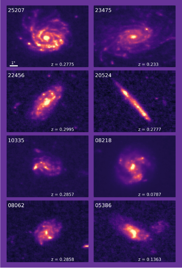 Eight galaxies of the “Gold Sample” are shown in the F435W band. These galaxies have a variety of inclinations and morphological features and have been chosen due to their high SNR in most bands and clear detection in both F275W and F435W.