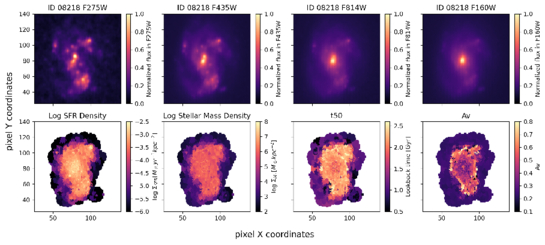 Shown is UVCANDELS 08218. Clear star-forming clumps appear in F275W and remain visible in F435W, but are hard to identify in the segmentation map. In the SFR density map, some features are visible on close inspection, with elevated SFR density in the upper-right and upper-left regions of the galaxy. The stellar mass density and t50 show little variation, while much of the galaxy has high AV.
