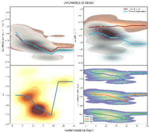 Radial profiles for 08062 in log ΣSFR, log sSFR, AV, and tx mass formation times show similar log ΣSFR shapes at both time steps, indicating little radial migration. Notably, the observed log sSFR is lower than that 1 Gyr ago in the outskirts, providing early evidence for outside-in quenching.