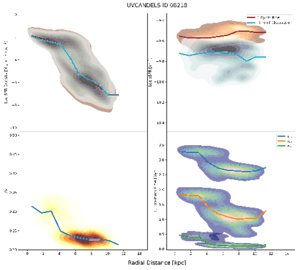 The log ΣSFR radial profile for UVCANDELS ID 08218 shows little evolution over the last Gyr in any region, but the ﹩\mathrm{log}﹩ sSFR profile indicates a slight decline in star formation across the entire galaxy.