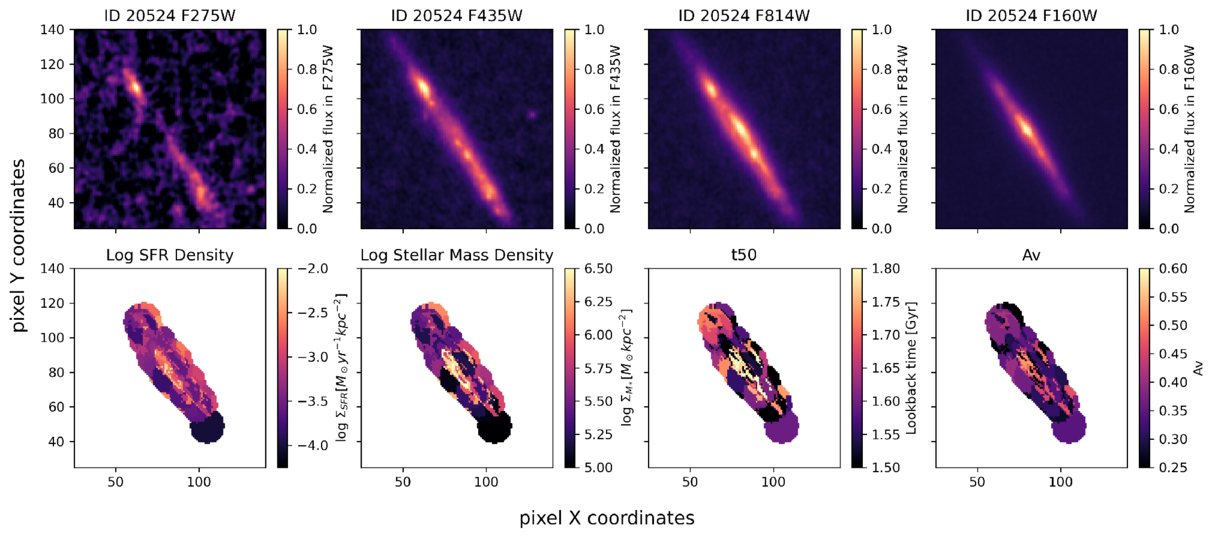 Postage stamps of the edge-on galaxy UVCANDELS 20524 show that while the F160W image is bulge-dominated, the F275W image is bright mainly in the outskirts—especially the upper left—rather than the center. This is consistent with dust obscuration, as supported by the AV map. However, the UV-bright region in the lower right does not show elevated properties, including AV, ruling out dust obscuration there. The SFR and stellar mass density maps show enhanced values along the top edge of the disk. The t50 map reveals both older- and younger-than-average regions in this area. Overall, these features may result from projection effects in an edge-on galaxy.