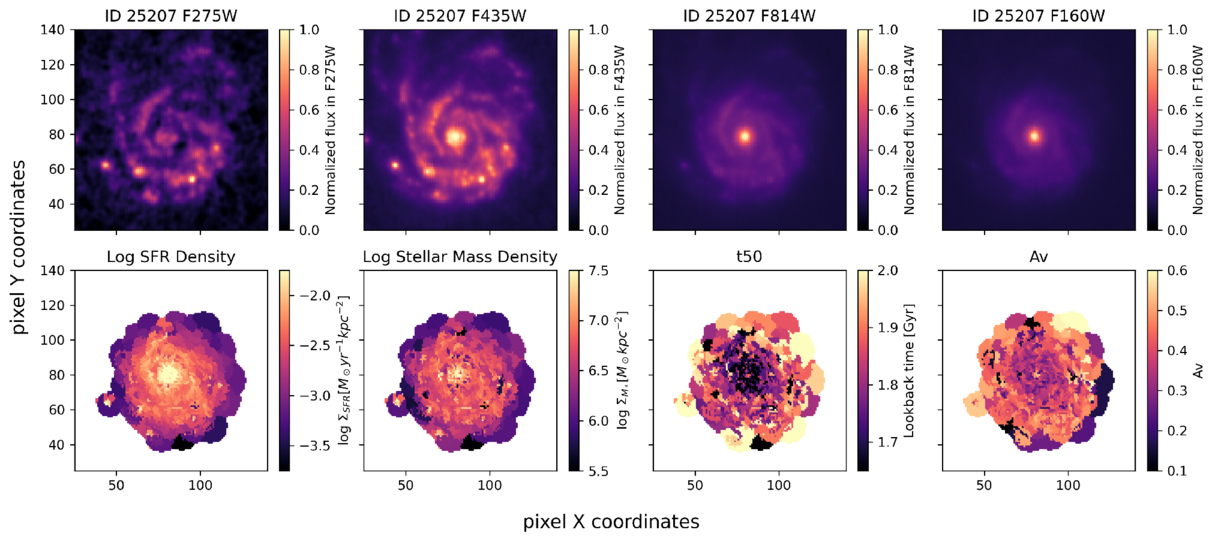 Postage stamps for the face-on spiral UVCANDELS 25207 show in F435W a bright bulge and clear spiral arms. In F275W, the spiral arms are also clear, with bright knots along the lower arm and a particularly bright knot at the apparent end of an arm on the far left. This knot, and several lower-image clumps, appear in the SFR density map, though these knots are small and hard to distinguish in all four property maps. Spiral arms are faintly visible in SFR density, but stellar mass density and AV show no strong patterns. The t50 map, however, shows younger regions tracing the spiral arms and central bulge.