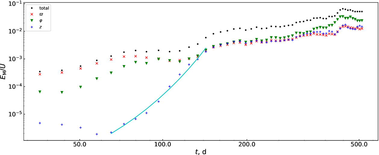 Magnetic field energies in the units of total heat (integrated over stellar material) as a function of time for the simulation BH 2. Black dots are total EM, red crosses are ﹩{E}_{\varpi }^{{\rm{M}}}﹩, green triangles are ﹩{E}_{\varphi }^{{\rm{M}}}﹩, and blue crosses are ﹩{E}_{z}^{{\rm{M}}}﹩. The solid cyan line is an exponential fit to ﹩{E}_{z}^{{\rm{M}}}﹩ in the range 60 days < t < 150 days.