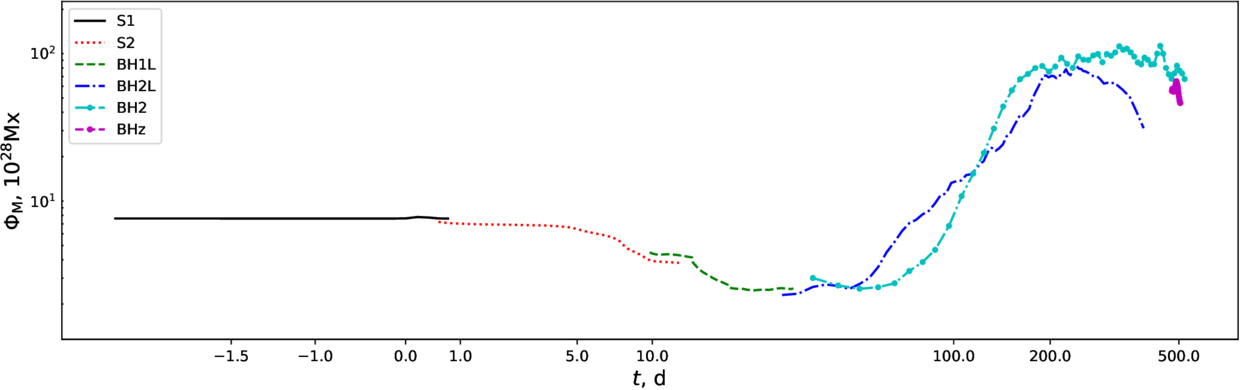 One-sided magnetic field flux as a function of time. Different curves represent different simulation stages: S1 (black solid), S2 (red dotted), BH 1L (green dashed), BH 2L (blue dotted–dashed), BH 2 (teal dashed with thick dots), and BHz (thick solid magenta line).