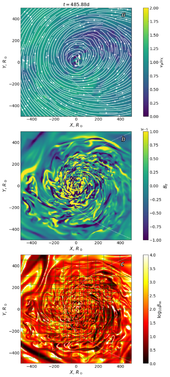 Simulation BHz at t ≃ 485 days. Panels show equatorial cross sections of rotation velocity in Keplerian units (a), vertical magnetic field (b), and βm (c). In panel (a), velocity stream lines are overplotted with solid white lines. Dotted green lines in panel (c) are the boundaries of mesh blocks. Dotted white lines show the initial orbit.