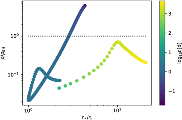Mean density (normalized by ﹩{\rho }_{{\rm{BH}}}={M}_{{\rm{BH}}}{r}_{* }^{-3}﹩) within the stellar debris (tracer condition s > 0.5) as a function of radial coordinate r* of the stellar center of mass throughout the simulation stages S1 and S2. Color indicates the time measured from the beginning of the simulation.