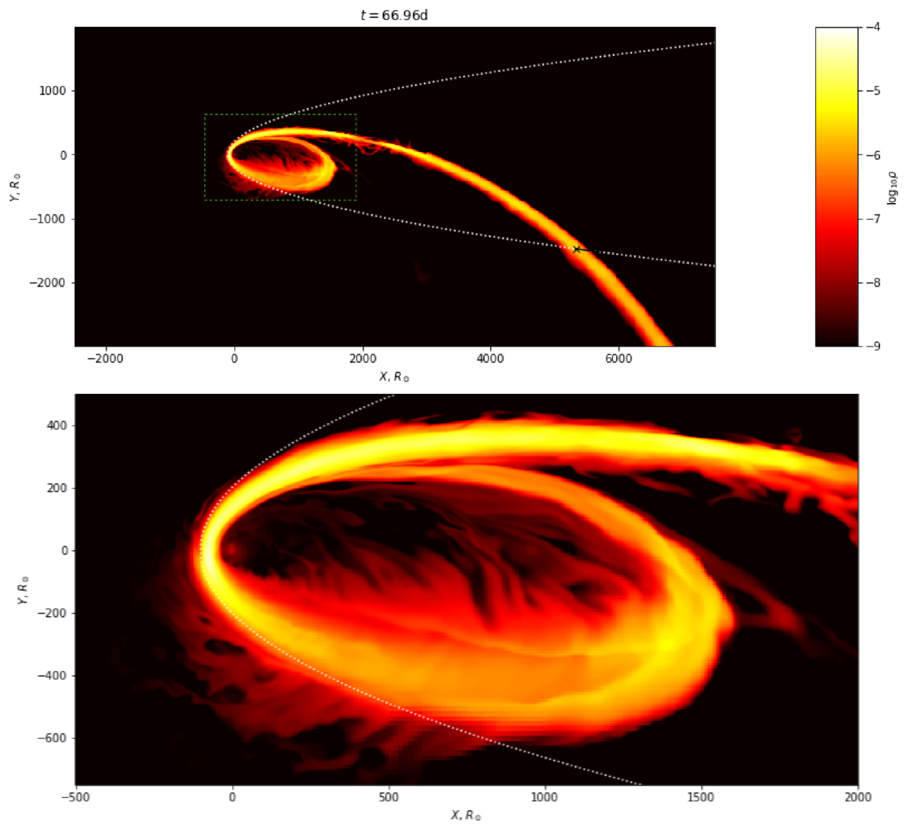 Equatorial-plane density map for t ≃ 67 days, for simulation BH 2L. The upper panel shows the whole frame, and the lower panel is a magnification of the region around the black hole (shown with a dotted green rectangle in the upper panel). The initial orbit is shown with a dotted white line. For the development of the density distribution with time, see the animation on YouTube (https://youtu.be/DmWdy8LakR8) and in the online Journal. The animation shows the density logarithm (﹩{M}_{\odot }/{R}_{\odot }^{3}﹩ units) evolution in the equatorial plane (simulation BH 2L). As in the static version, the white dotted line shows the initial parabolic orbit of the star.