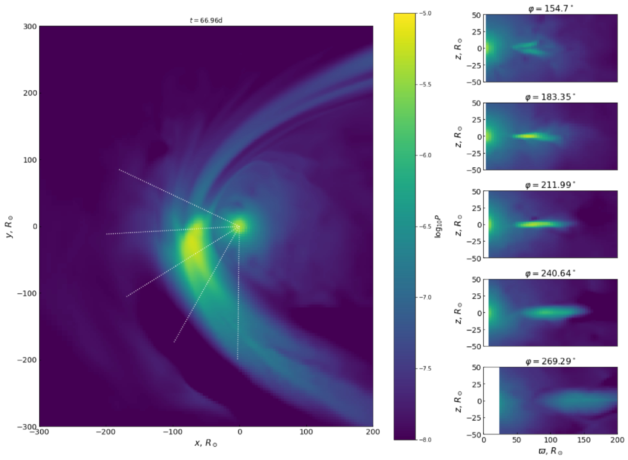 Pressure distribution in the equatorial plane (left panel) and in several meridional planes (right panels; the corresponding cross sections are shown in the left panel with dotted white lines) covering the region of the pericenter and the nozzle shock. The color scale is logarithmic and identical in all the cross sections. The simulation stage is BH 2L, t ≃ 67 days. The right panels use a cylindrical radial coordinate ﹩\varpi =\sqrt{{x}^{2}+{y}^{2}}﹩.