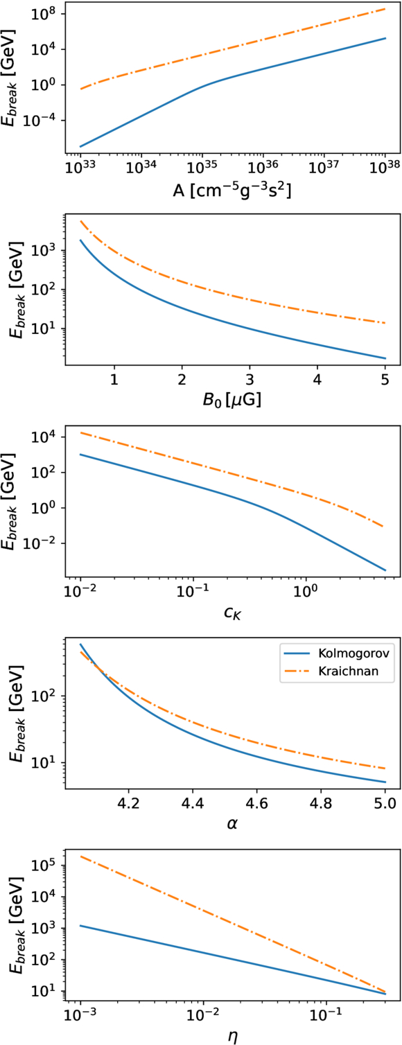 Comparison of the expected break energies for different values of A, η, cK, α, and B0 in the case of either the Kolmogorov- or Kraichnan-type of wave cascade. The respective fixed values are chosen as in Figure 2.