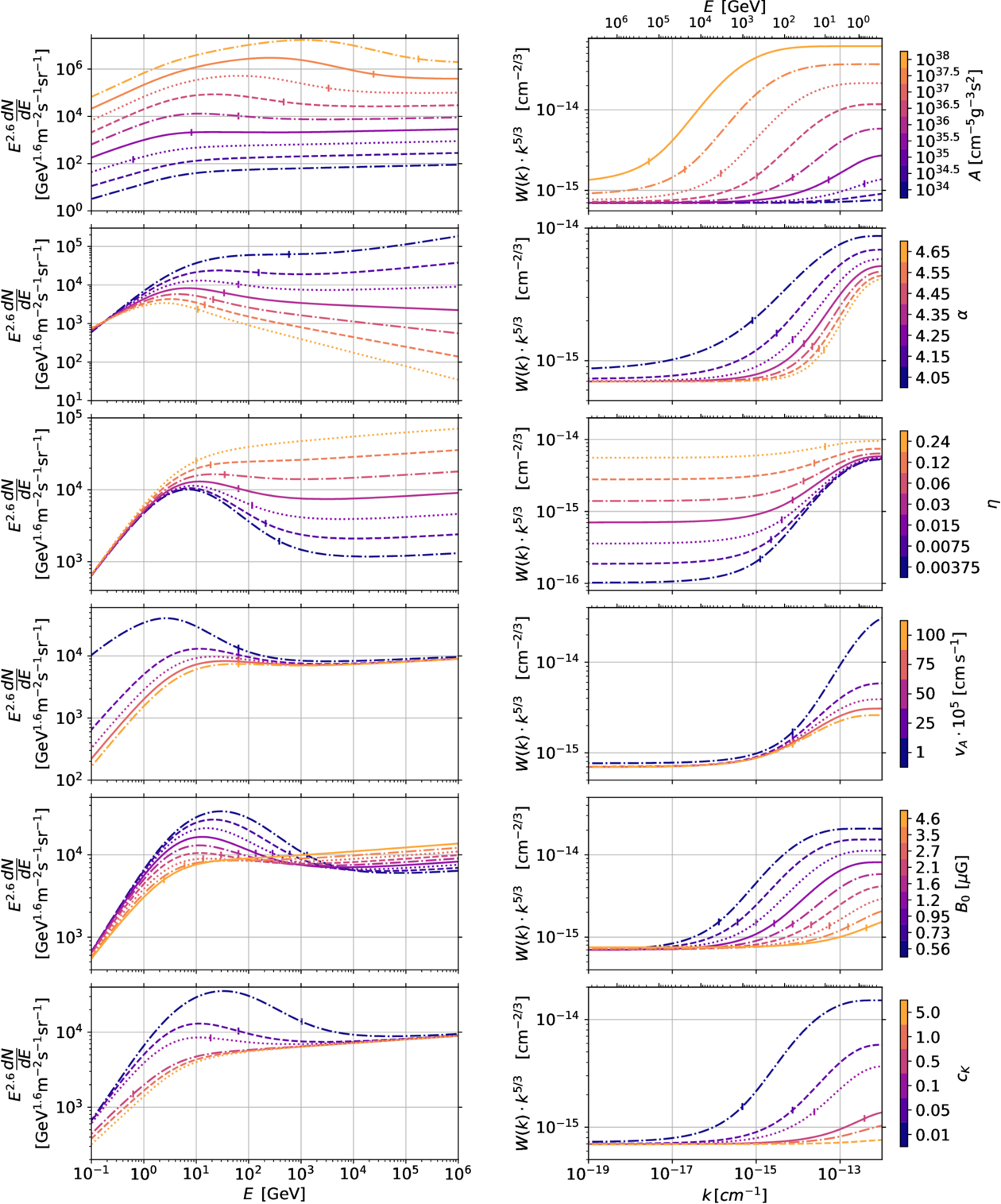 Kolmogorov. We vary the model parameters around the default parameter set (as specified in Figure 2), one in each row, while keeping the rest fixed. Line styles change from dashed–dotted, to dashed, to dotted, to solid with increasing parameter value. The energies for the right plots are derived as ﹩E=(\sqrt{1+{(q{B}_{0}/(km{c}^{2}))}^{2}}-1)m{c}^{2}﹩, except for the second-to-last row, where we varied B0. The expected breaks according to Equation (16) are denoted by small vertical lines.