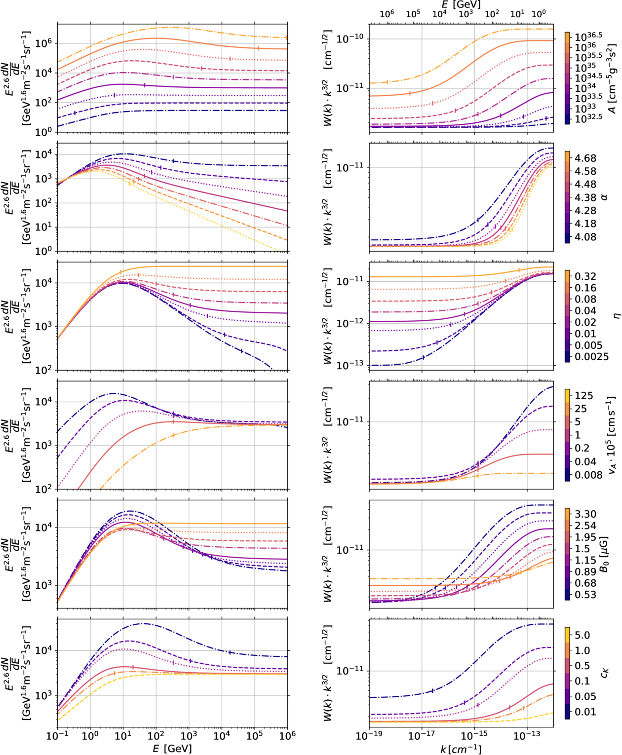 Kraichnan. Starting from the default values, the parameters are changed in a similar manner as in Figure 3, with the line styles kept in the same changing order. Again, small vertical lines denote the expected breaks due to the streaming instability.