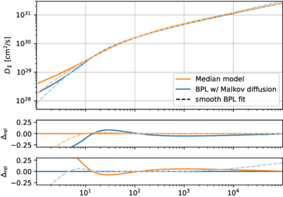 Comparison of the diffusion coefficient as used in this work (median model) to the approximated BPL wave spectrum (see Figure 8) on which the pitch-angle-dependent resonance from M. A. Malkov et al. (2024) was applied. To assess the smoothness of both curves, they were fitted with smooth BPLs following Equation (A2) (dashed lines). The two lower panels show the relative differences of these fits to their corresponding models (middle panel: median model; bottom panel: BPL model) to measure the goodness of both fits.