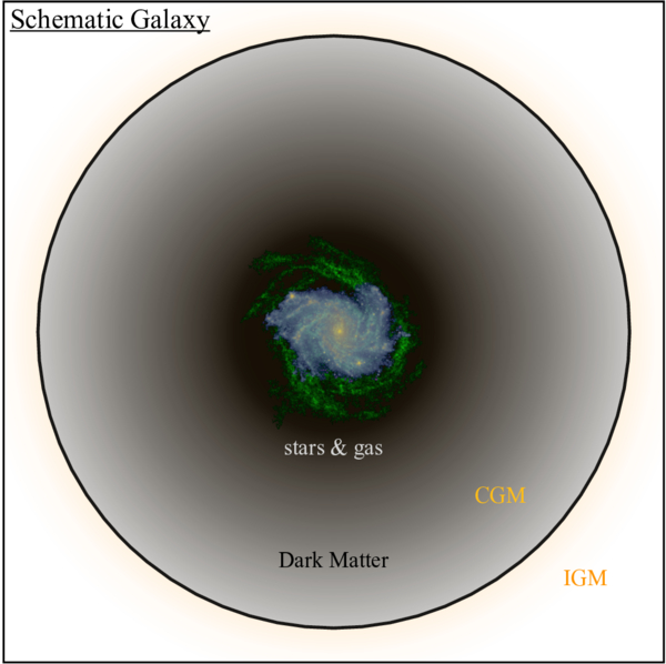 Conceptual elements of a galaxy: the stars (yellow/blue) and atomic gas (green) of NGC 6946 (Spitzer 3.6μ and 21 cm data: F. Walter et al. 2008) are shown embedded in an extended dark matter halo (black). The dark matter density decreases continuously with radius so the halo has no hard edge, but for convenience, we adopt the common convention that the radius r200 marks the boundary of the dark matter halo and the dividing line between the CGM and IGM (orange). The stars and gas illustrated here appear within r < 20 kpc while r200 ≈ 220 kpc (not shown to scale).