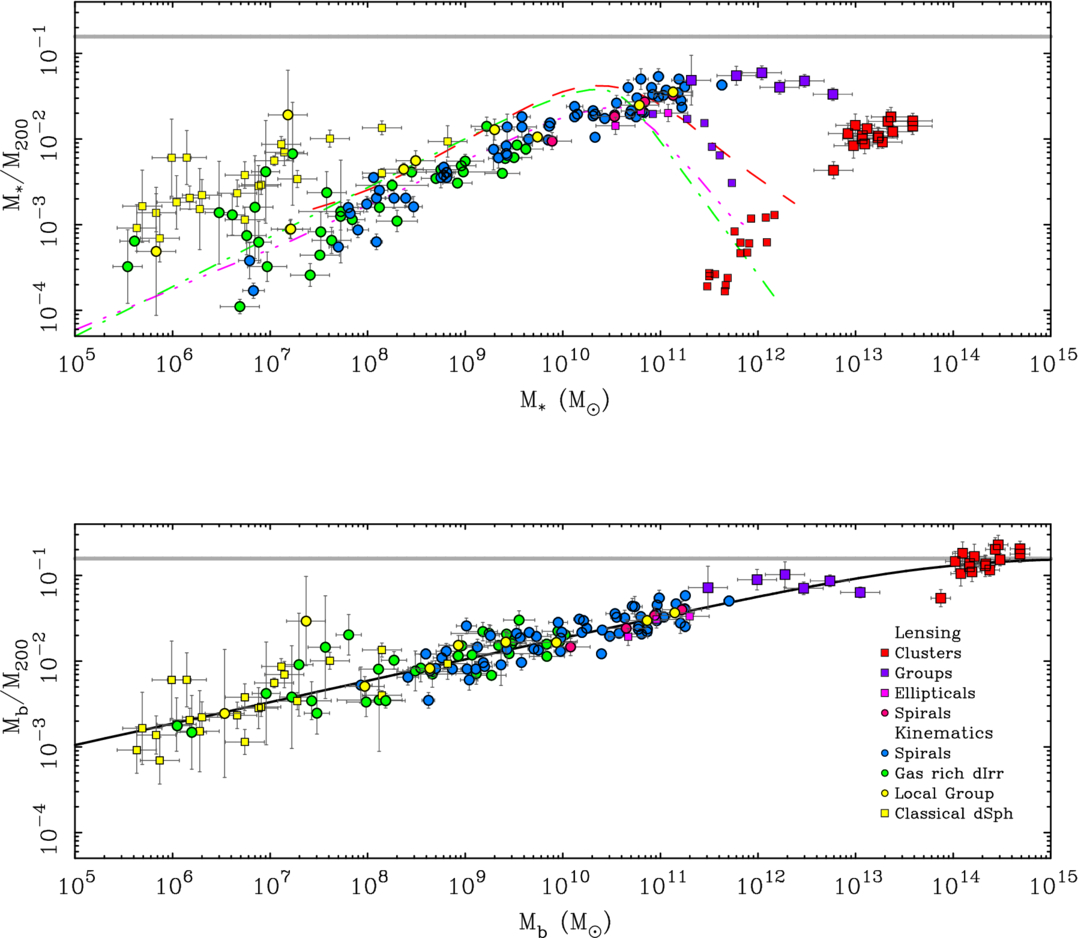 The stellar mass fraction as a function of stellar mass (top) and the baryonic mass fraction as a function of baryonic mass (bottom). Data and symbols as in Figure 3 with the additional distinction that large squares in the top panel represent the sum of the stellar mass of all galaxies in a group or cluster while small squares are the stellar mass of the brightest galaxy only. The horizontal line is the cosmic baryon fraction fb = 0.157 (Planck Collaboration et al. 2020). The colored lines in the top panels show the stellar mass–halo mass relations from abundance matching given by B. P. Moster et al. (2013; dashed–dotted green line), P. S. Behroozi et al. (2013; dashed–triple dotted pink line), and A. V. Kravtsov et al. (2018; red dashed line). The black line in the lower panel is Equation (12).