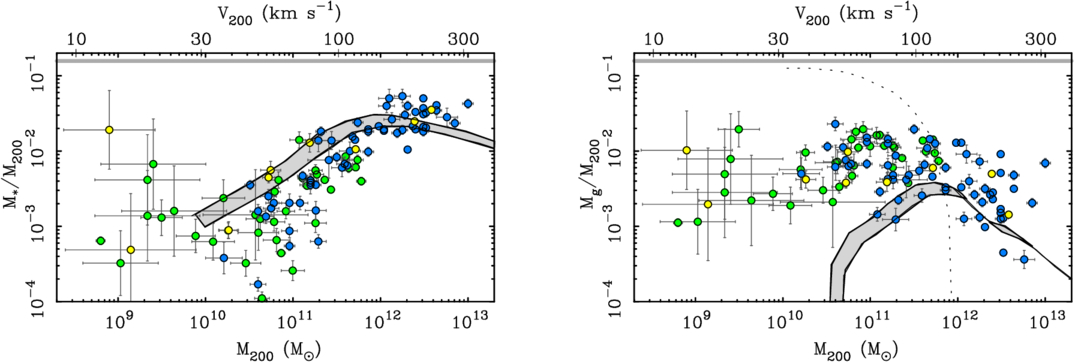 The stellar mass fraction (left panel) and gas mass fraction (right panel) as a function of mass M200 with the equivalent V200 on the top axis. Data and symbols are the same as in Figure 3; the sample is restricted to objects for which both stars and gas are directly measured for each galaxy. The lines show the expectation for central subhalos in the EAGLE simulations (P. D. Mitchell & J. Schaye 2022) with the width of the gray bands representing the range of fv from 1 (bottom edge) to 1.4 (top edge). The dotted line in the right panel denotes the limit where gas is precluded from accreting onto halos in the EAGLE simulations.